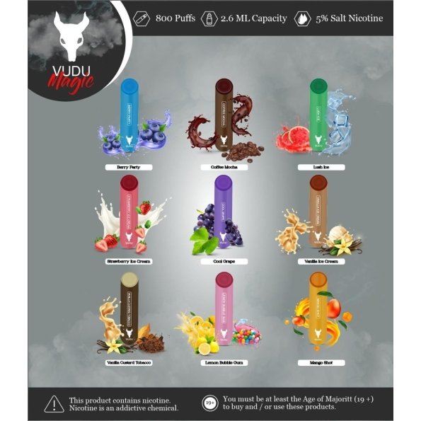 | الطعم | ليمون بابل جم, مانجا, عنب, فراوله آيس كريم, فانيليا آيس كريم, توباكو كاستر فانيليا, قهوة, توت, رقي |